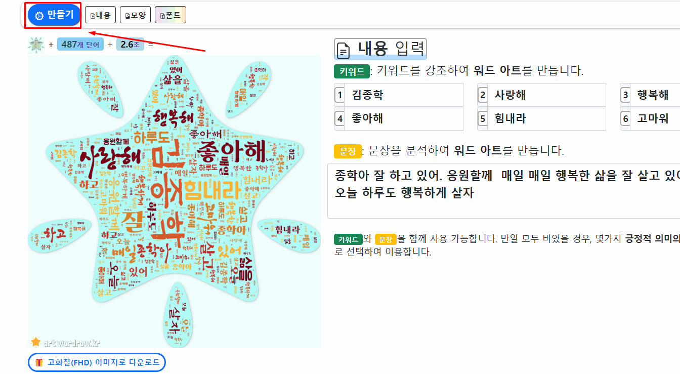 워드아트 사용법은 내용 입력 → 모양 설정 → 폰트 설정 → 폰트 색상 → 배경 색상 선택 → 배경 색상 바꾸기 → 만들기 순서로 진행됩니다.
